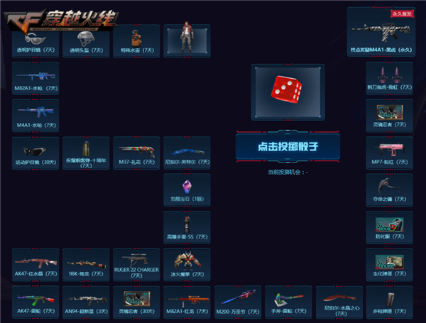 活动期间,加入了不同平台的CFer每点亮一个特权图标,除了能够领取1件装备,还将获得一次幸运大抽奖的机会。M200-涂鸦(永久)、破天狂龙(180天)与M4A1-粉水晶(30天)均可通过抽奖免费领取。