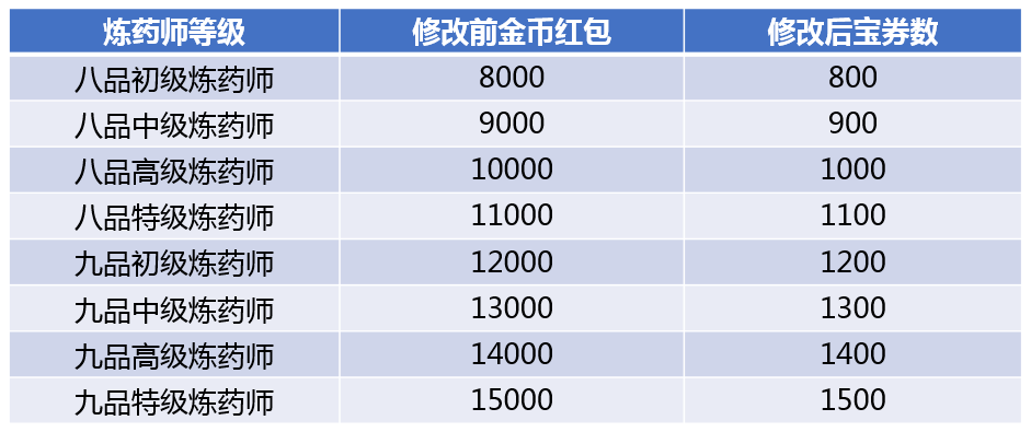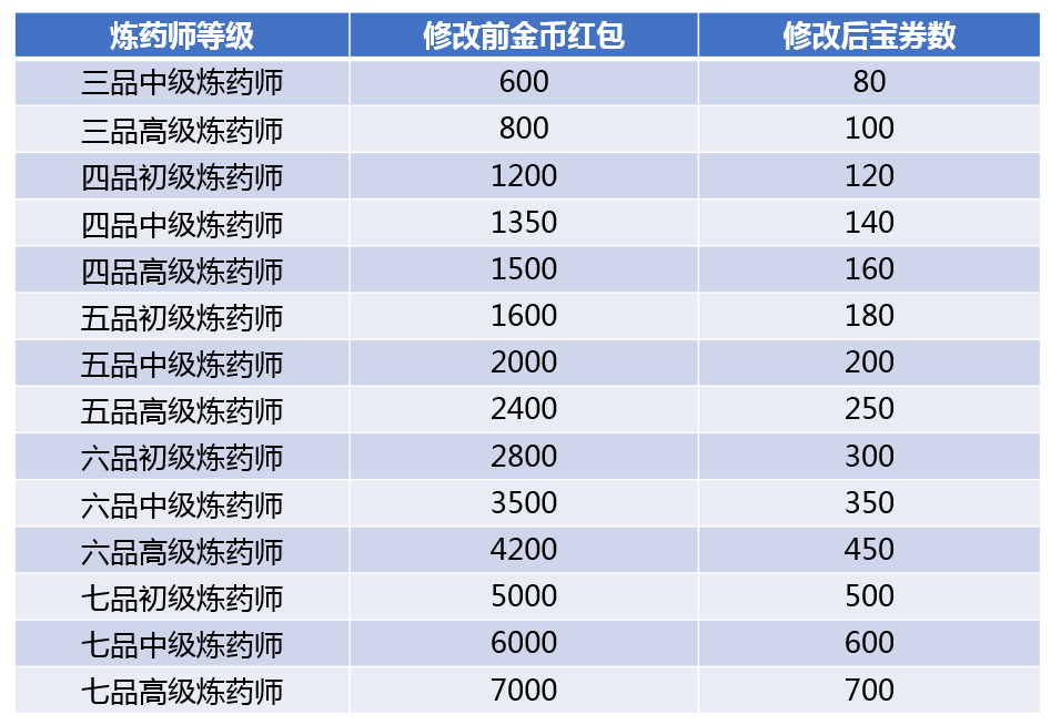 1、炼药师升阶奖励将由红包奖励改为宝券奖励,优化将在12月31日进行更新: