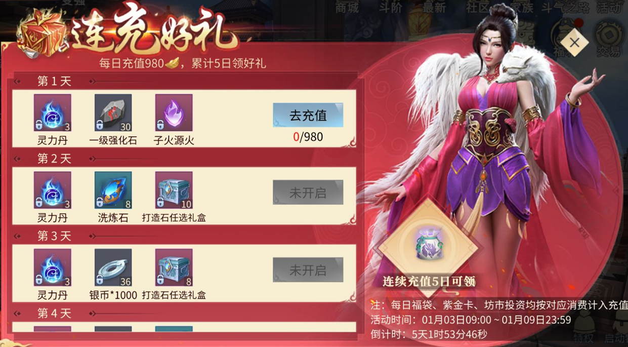 1)斗者每日充值达到980元宝,即可领取当日的珍稀奖励道具。