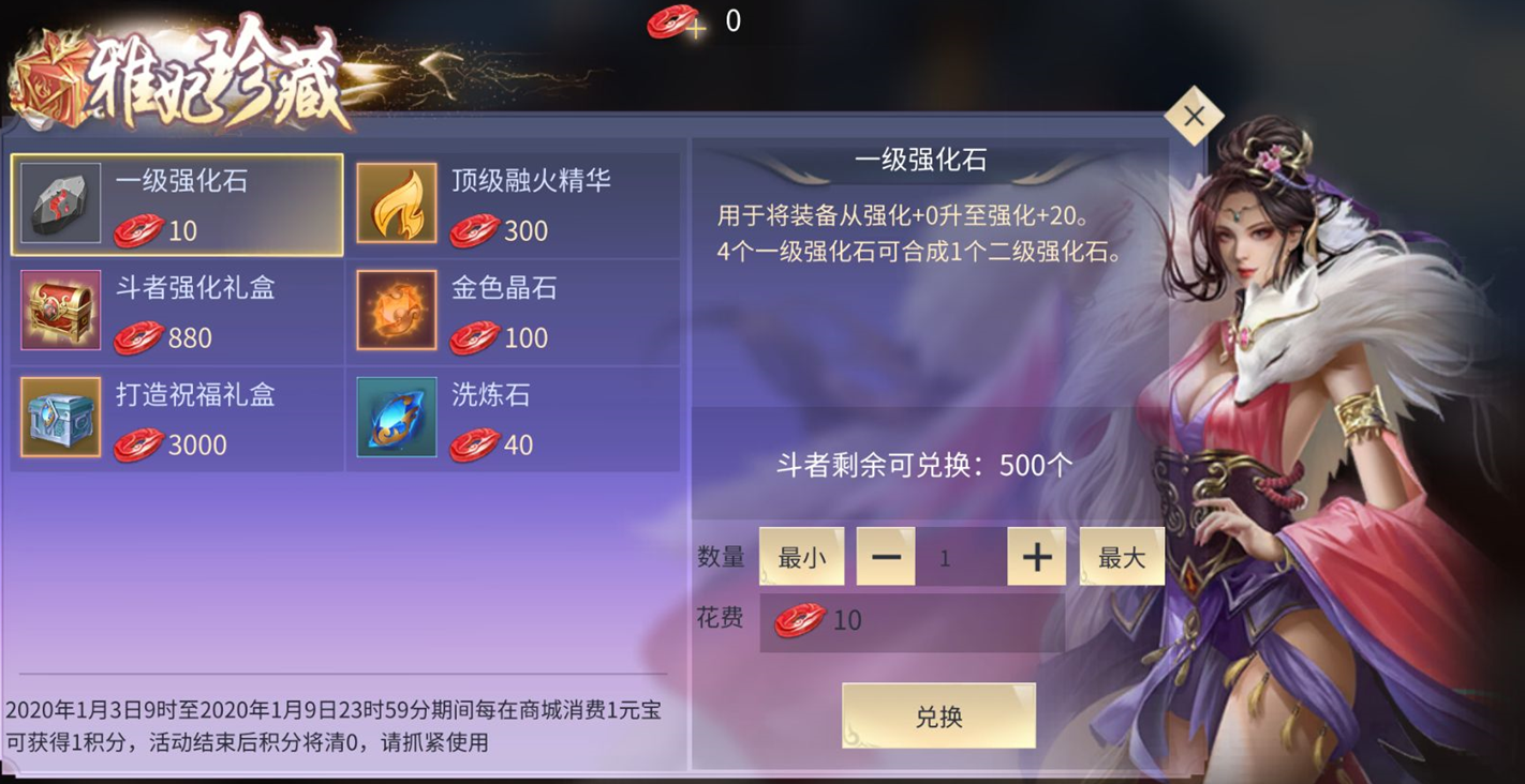 雅妃在活动期间将开放珍藏宝库,为斗者挑选珍稀道具,斗者在活动期间每在商城消费1元宝可获得1积分,活动结束后积分将清0,请斗者抓紧使用,积分可在雅妃处兑换各式道具。